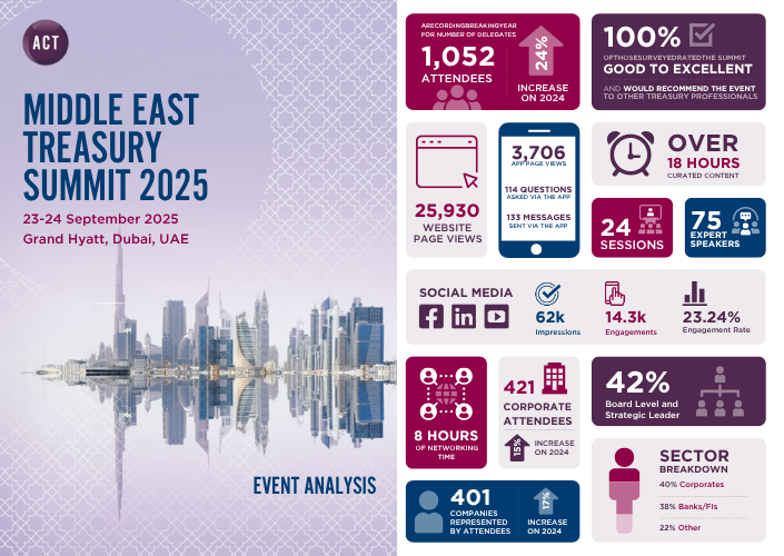 The ACT Middle East Treasury Summit returned to the Grand Hyatt in Dubai on 23-24 September 2025. The conference brought together the region's treasury and finance community for two days of engaging content, networking, and connecting with leading treasury suppliers in the exhibition hall.